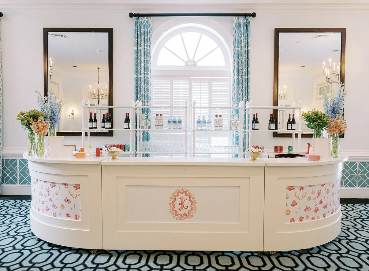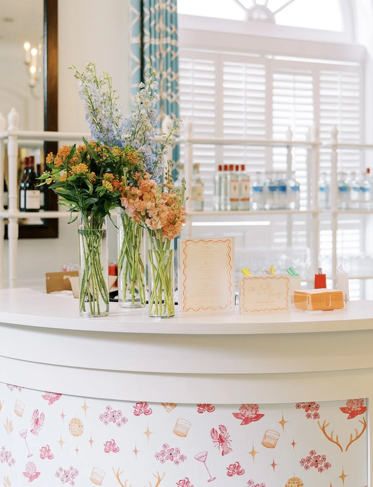 The bar art mirrored the icons from the envelope liner, but in a lively pink-and-orange color scheme instead of the liner’s blue-and-green palette. This thoughtful color shift created a fresh, fun look while keeping the design uniquely personal to Jordan and Kemp.