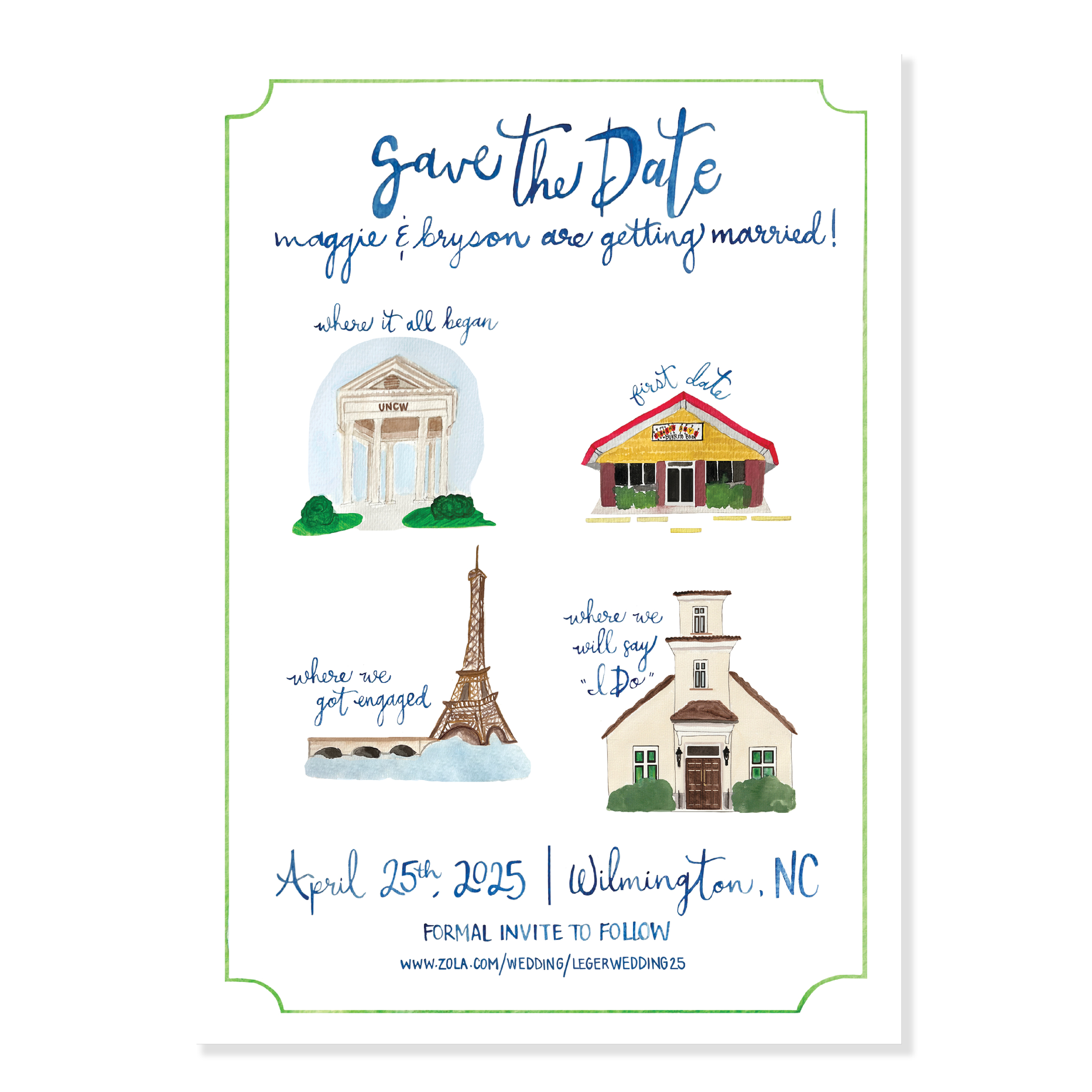 What makes Maggie and Bryson’s save the date so special and unique to them, is it features the four special spots where major milestones in their relationship took place.
